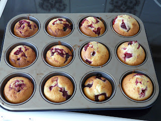 Häll upp i muffinsformar och toppa med hallon. Frysta hallon kan gärna vara frysta när de
